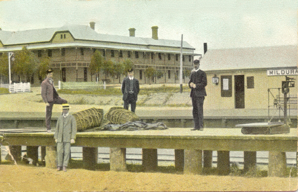 The goods platform at Mildura prior to 1910. Note the Coffee Palace - now the Grand Hotel - in the background. From an Old Postcard: Bruce McLean Collection
