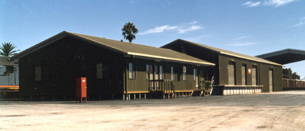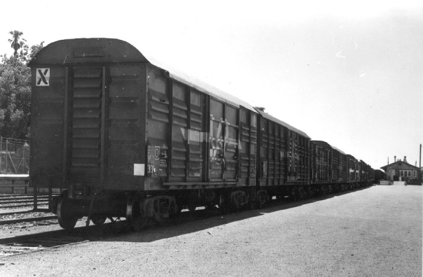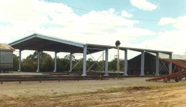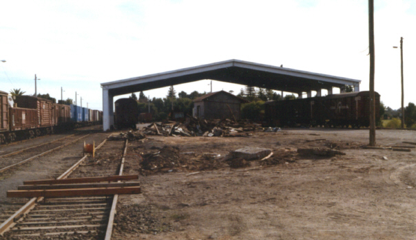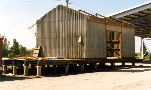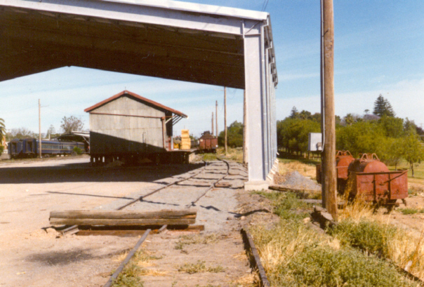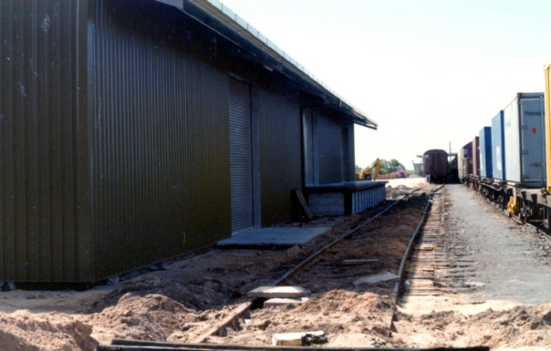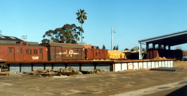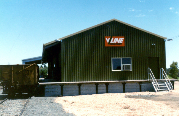 Tenders were called on 27-3-1985 for the design and construction of a Freightgate building at Mildura. Demolition of the galvanised iron goods shed commenced on 3-7-1985 to make way for the new building at a cost of $114,000 to construct. To enable a service to be maintained to customers, six off-register B vans were brought to Mildura and stabled in No.4 road for storage of inwards and outwards goods.