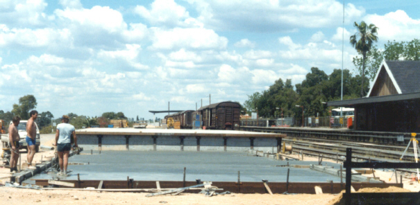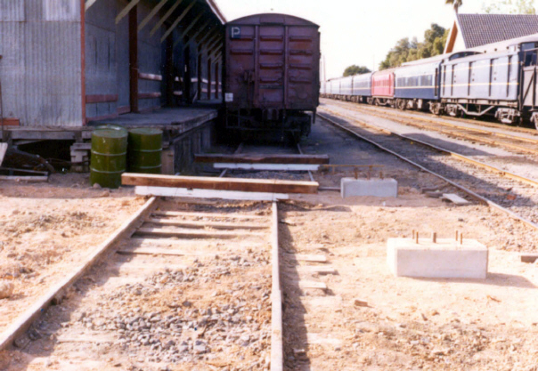 With the goods shed nearing completion, No. 4 road was realigned to pass the platform at the correct distance. 17-11-1985. Photo: Bruce McLean