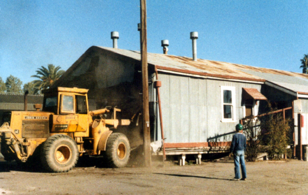 The beginning of the end. Demolition of the Mildura goods shed gets under way as a rubber-tyred bulldozer lines up the historic building. 3-7-1985. Photo: Wally Cook, courtesy Gary Sharman