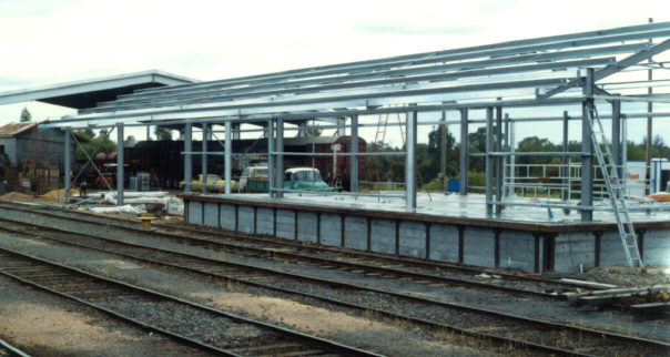 By 14-9-1985 the goods shed high level platform was well advanced. A low level area was being prepared between this structure and the Freight Gate canopy. Photo: Bruce McLean