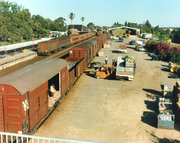 The scene at Mildura on the morning of 4-12-1985 as goods from the "Fruit Flier" are unloaded and loading of produce and other Mildura exports commences. The new goods shed can be seen in the background. Photo: State Transport Authority