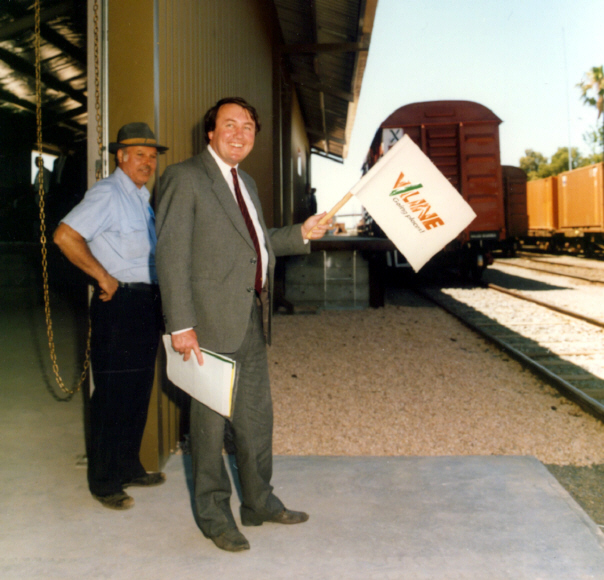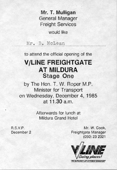 The Consultative Committee of V/Line (a trading name adopted from August 1983 in lieu of VicRail), Union and Transport Ministry representatives met with local government, business and community groups from the Mildura and Robinvale areas at the Mildura City Council offices on 7-2-1984. It was announced in May 1984 by the Minister of Transport, Mr. S. Crabb, that Mildura would become a key "Freightgate" along with ten major rail centres throughout the State. Formal establishment of the Freightgate road to door service within town limits was advertised to the general public on 25-10-1984 and the Mildura Freightgate was officially opened on 1-2-1985.