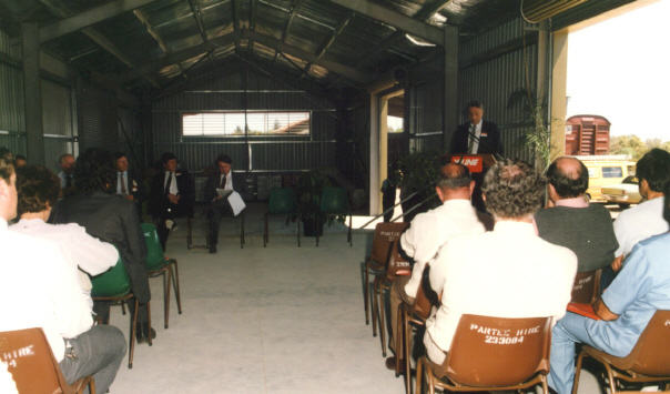 The official opening ceremony took place in the new goods shed on 4-12-1985. At the podium is the Chairman of the State Transport Authority, Mr. K. Fitzmaurice. The Minister for Transport, Mr. T. Roper (seated), is studying his speech papers. Other speakers included the Mayor of Mildura (Mr. J. Kane) and Mr. T. Mulligan (V/Line General Manager, Freight Services). Photo: State Transport Authority