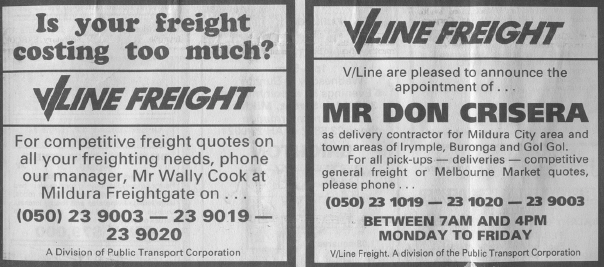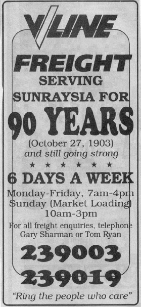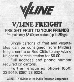 Mildura Freightgate placed advertisements seeking competitive freight quotes in local newspapers in April 1991 reflecting the changing nature of the freight operation to more aggressive marketing of the rail service. A campaign to "freight fruit to your friends" to any V/line station for $6.00 appeared throughout May 1991.