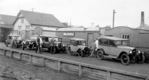 Austin cars delivered by rail to Mildura for Mr. J.H. Bayliss in the mid-1930's. The cars were unloaded from rail wagons onto the passenger platform. Photo: Mrs. C. Bayliss Collection