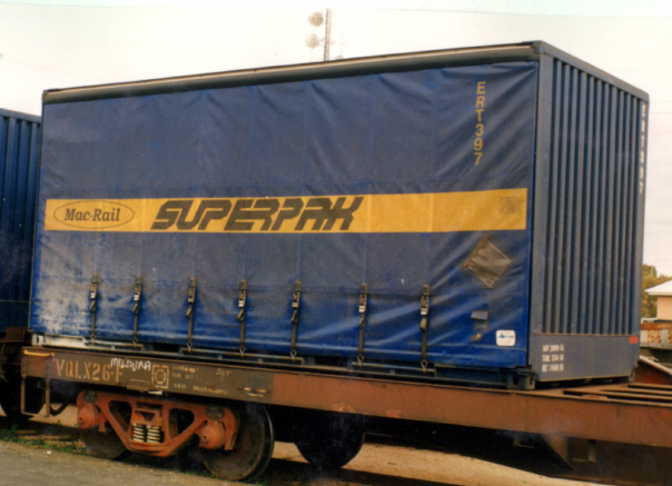 New curtain sided containers for Superfreighter traffic. The first Superfreighter ran from Melbourne to Mildura on 29-6-1993 and these wagons were photographed at Mildura the following day. Photo: Bruce McLean