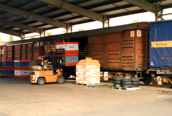As at June 2003, life at Mildura Freight Centre continued with the arrival each morning Monday to Friday of the overnight freight train conveying Fast Track containers and wagons for general loading, fuel for the Shell Depot, cement for Blue Circle's cement siding and the intermodal container traffic for Wakefield's at Merbein.