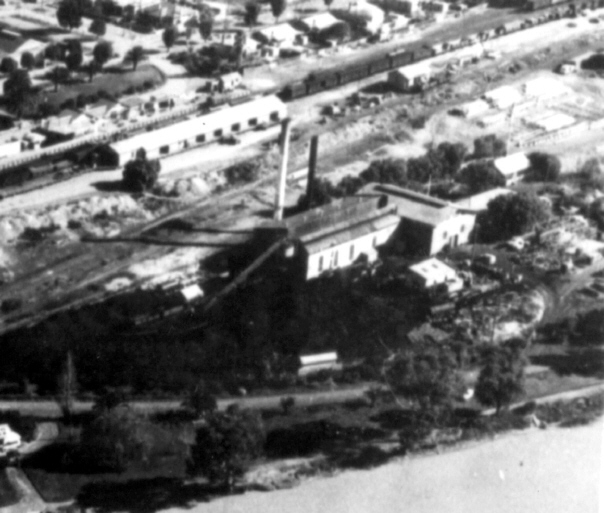 This 1956 aerial view of Mildura from the riverfront has been enlarged to show the relationship between the Murray River in the foreground, the power station, Box factory (top right), goods shed and passenger station. Photo: Bruce McLean Collection