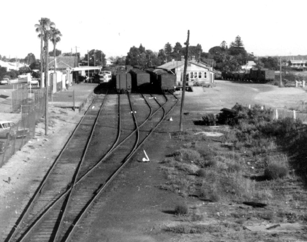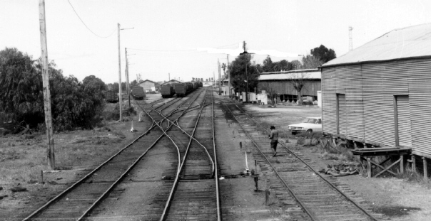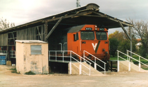A former feed and grain store adjacent to the diesel locomotive storage tracks was dismantled in April 1980. The business was operated for many years by Mr. F. Clayton and in more recent years by Mr. T. Waller who painted the shed a sky blue color. The nearby weigh-bridge was used for loads of produce to be weighed for delivery around Mildura and motor vehicles which were required to be weighed by law for registration. The shed was removed to provide an additional locomotive storage track and inspection pit.