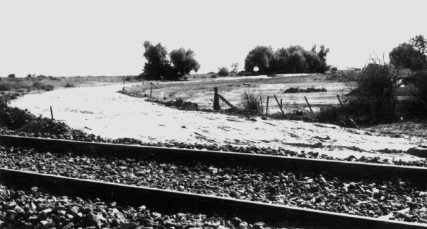 The record floods of 1956 completely claimed the wharf siding and came up to the cattle yards siding below the main line railway embankment. In this view a ganger's trolley is being used as work is being done on a levy bank. The former Mildura Urban Water Trust pumping station can be observed in the background. Photo: Joan Lee