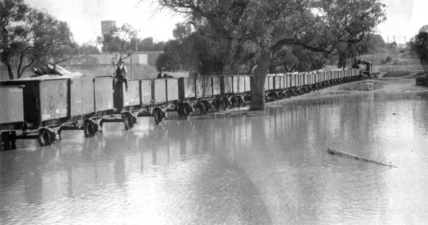 A train load of sleepers standing on the flooded Construction siding near Mildura wharf, circa 1924. Photo: Wilf Henty, courtesy John Kiely