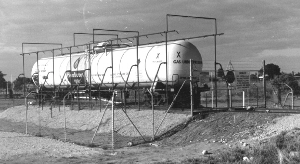 An LP gas tanker stands on the new siding built by the Gas and Fuel Corporation on 5-5-1979. Note the elaborate safety system around the tanker. Photo: Bruce McLean