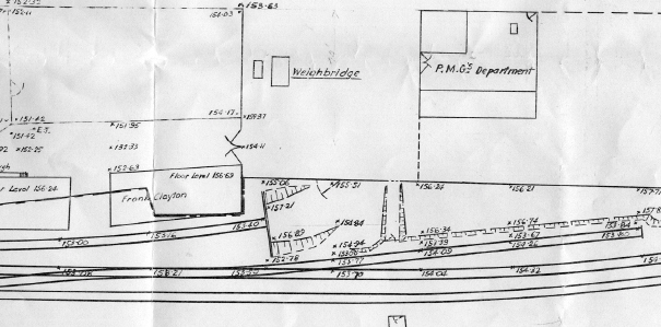 Part of a 1933 drainage plan of Mildura station yard showing the dead end siding to a loading bank near the Walnut Avenue weighbridge and the Post Master General's department siding adjacent to the P.M.G. depot on the corner of Seventh Street and Walnut Avenue. Source: Bruce McLean Collection