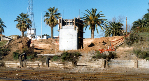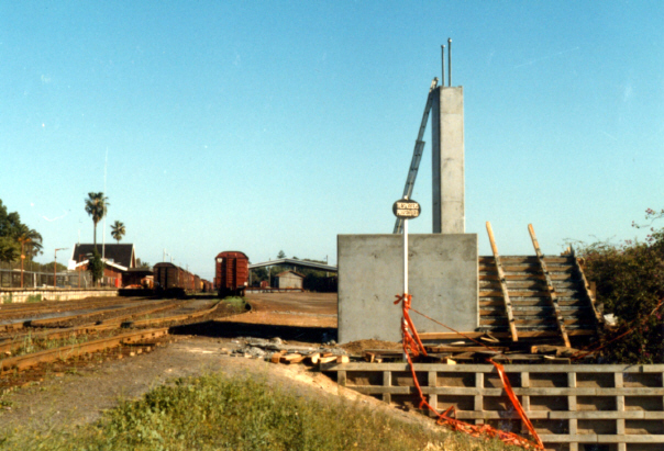 Work on the Seventh Street side abutment of a new footbridge near the site of the former road overbridge, was well underway by 14-8-1985. Photo: Bruce McLean
