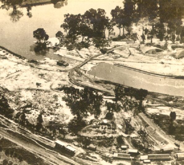 Construction of Lock 11 at Mildura. The railway siding to the lock site traversed the embankment at lower right. Circa 1923. Photo: Bruce McLean Collection