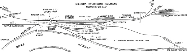 Subsequent roadway construction and landscaping of the riverfront area has now obliterated any sign of the small network of railway lines that once served Mildura's riverfront and utilised the unique facility of a "zig-zag".