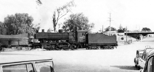 J516 shunting the Mildura wharf siding. The main line to Melbourne crosses the Madden Avenue bridge in the background. The cattle yards siding, built in 1950, passes under the pepper trees behind the locomotive, extending to the left. Date unknown. Photo: Reg Phillips
