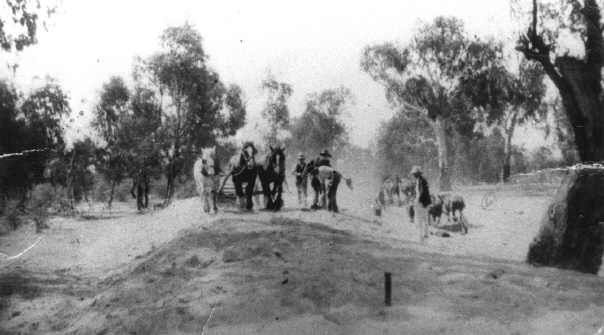 Mr. D. McKay's horse team constructing the branch line to the site of Lock 11 at Mildura in 1922 for the South Australian government. Photo: D. McKay from Bruce McLean Collection