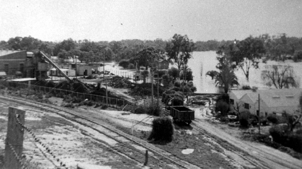 The Murray River was in a record flood in 1956 when this view of the power station siding was taken from the overhead bridge leading to Mildura goods yard. The Rowing Club sheds are to the right and the downgrade line from the yards to the riverfront is in the foreground. Photo: Joan Lee
