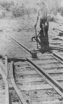 Press cutting from "Sunraysia Daily" showing a railway worker dismantling the section of the former Mildura Powerhouse (later State Electricity Commission) siding at Mildura on 14-1-1965. Source: Bruce McLean Collection