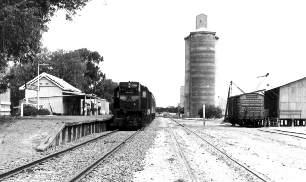 The Grain Elevators Board opened a concrete 110,000 bushel grain elevator in November 1939. This was the first concrete silo in Victoria and was officially opened by Cr. E.D. Lackmann of the Murrayville Riding of the Shire of Walpeup on 21-11-1939. The first wheat to be delivered to the silos was grown by Mr. G.J. Cassens. The elevator was positioned on the dead end extension at the down end and three sheds were required to be removed to allow the site to be used. These sheds were privately owned by farmers for transferring bags of superphosphate from rail trucks to wagons thus avoiding extra lifting and lumping of heavy bags.