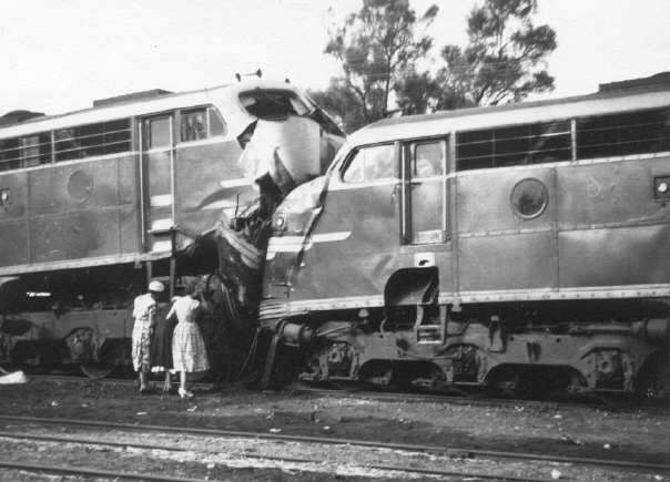 B63 (left) on the up "Fruit Flier" smashed into stationary B81 on a Mildura-bound goods at 5.45 p.m. on 19-4-1960 at Redcliffs. Refer to details and more photographs in the Accidents and Incidents section. Photo: Barry Kerr, Geoff Pianta Collection