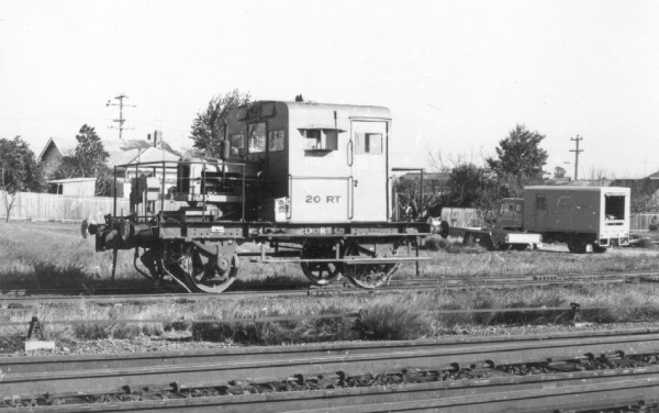 Rail Tractor 20RT standing on the long siding leading to the Redcliffs Co-operative Fruit Co. packing shed. The truck in the background was provided for the track gang based at Redcliffs. 18-8-1979. Photo: Bruce McLean