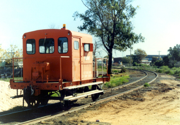 Rail tractor RT25 standing on the Red Cliffs Co-operative Fruit Company siding within the station ground. This lengthy siding continued across a street and wended its way between packing shed buildings. 3-8-1991. Photo: Bruce McLean