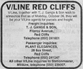 V/Line announced in October 1992 that T.J. Gange & Son (freight enquiries) and Plant Elegances (passenger enquiries) would be agents for parcels and freight from 26-10-1992. All other enquiries were to be directed to the Stationmaster at Mildura. The Redcliffs Newsagency took over passenger enquiries in April 1993.