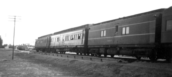 Yarra parlour car, Goulburn special car and Carey shower car were attached to the ARHS (Victorian Division) special tour train to Mildura and Pinnaroo. Taken at Nowingi on12-4-1968. Photo: Bruce McLean