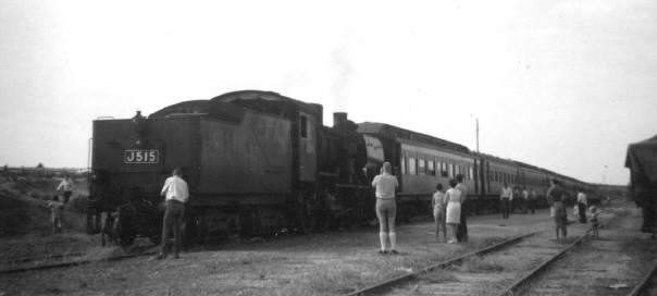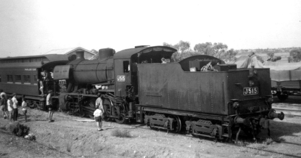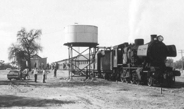 Arrival at Pinnaroo was 12.45 p.m. (South Australian time). At Pinnaroo J515 was replaced by the South Australian Railways 526 "Duchess of Gloucester". A 9,000 gallon water tanker. BE carriage, three joint-stock sleeping carriages and a guard's van were added to the train bring it up to 16 vehicles.