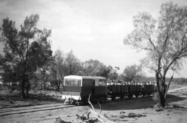 At Nowingi, the Society had made arrangements with the Brunswick Plaster Mills for passengers to travel behind their 0-6-0 diesel locomotive along the 16½ miles of privately maintained track to the gypsum loader at the Raak Plain. This line was originally built as a developmental railway towards Millewa South but was abandoned after construction of the first 24 miles. Extensive copi deposits ensured that part of the line was able to remain in service for transporting gypsum by rail for further processing.