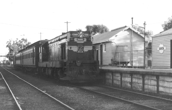 T346 with its special train stands in the early morning light at Ouyen ready to depart for Pinnaroo with members of the Australian Railway Exploration Association (AREA).19-11-1977.Photo: Bruce McLean