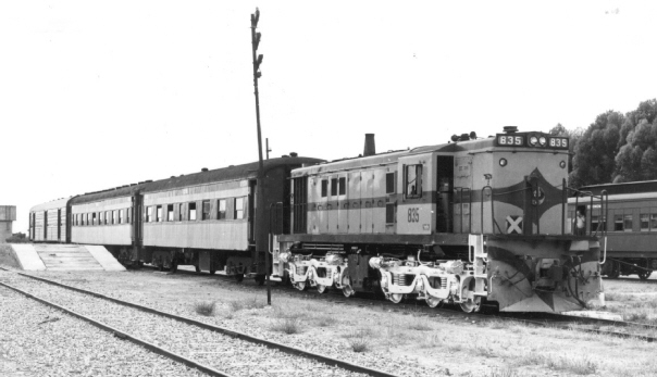 Sparkling clean 835 and its train ready to depart Pinnaroo with the AREA party for the South Australian leg of their round journey from and to Melbourne. The travellers off this train changed over to the Victorian train hauled by T346 to return to Ouyen and Melbourne.19-11-1977. Photo: Bruce McLean