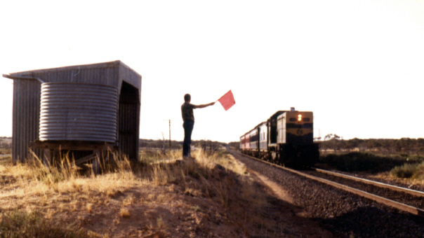 The power of a red flag! The author is silhouetted against the morning sun at 8.02 a.m. as he holds a red flag to stop the AREA special train at the site of Bronzewing station on 30-12-1981. The author and fellow enthusiast John Page, then alternated riding on the train and following it by motor car between stopping points. Photo: John R. Page