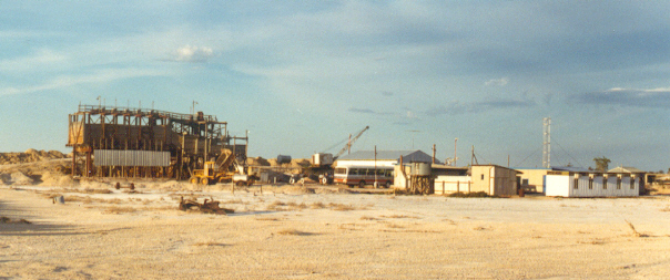 A general overview of the plant at Raak Plain looking in a northerly direction. The over-rail loader is to the left with the washing equipment behind it, the red and white Mildura Bus Lines bus is standing near the workshop and the buildings to the right were the workmen's mess and accommodation quarters. 30-12-1981. Photo: Bruce McLean
