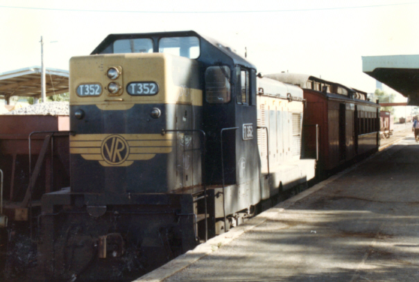 T352 and 2BCE stand in Ouyen platform waiting for departure to Pinnaroo with the AREA Special on 17-3-1984. Photo: Bruce McLean