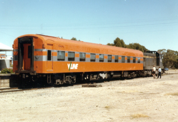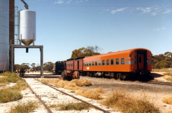 A similar arrangement was undertaken on 17-3-1984 by the two organizations. Members of the AREA traveled from Melbourne to Ouyen on "The Vinelander" overnight service. Car-van 2BCE had been worked to Ouyen in advance and was attached to locomotive T352 for the journey to Pinnaroo. The special train was scheduled to depart Ouyen at 9.15 a.m. and arrive at Pinnaroo at 12.12 p.m.. The RTA special consisted of V/Line sleeping car SZ287 (formerly VAM1) attached to an Australian National grain train from Tailem Bend to Pinnaroo. SZ287 would then be attached to the AREA train with the scheduled departure from Pinnaroo at 12.45 p.m. and arrival at Ouyen 4.18 p.m.. At Ouyen, after reversing the locomotive, the special was scheduled to depart at 4.30 p.m. for Donald where arrival was scheduled for 7.10 p.m.. The Ouyen crew of Mr. H. Lauder (Driver) and Mr. W. Weuffen (Guard) were in charge of the train.