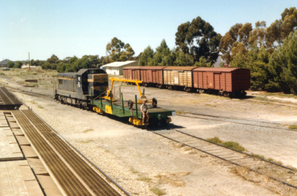 An unexpected "bonus" for the AREA and RTA rail enthusiasts was the addition of Australian National flat wagon AFFA8544 with a load of farm machinery. The wagon was destined for Ouyen and it was an early opportunity to transfer the wagon to its destination. Pinnaroo 17-3-1984.Photo: Bruce McLean