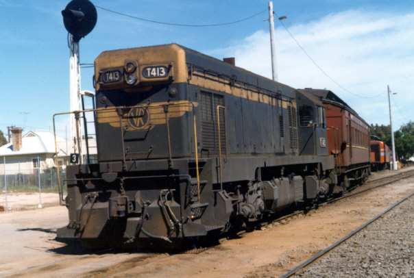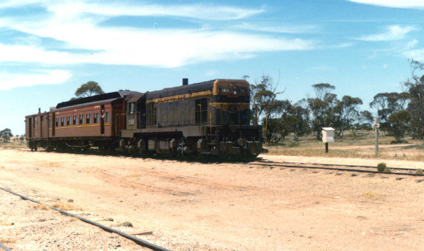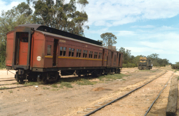 Sensing the possible closure of the Redcliffs to Meringur line as an outcome of the CANAC report recommendations, members of the Australian Railway Exploration Association (AREA) travelled to Mildura on "The Vinelander" and chartered a special train to inspect the branch line on 23-11-1985. Carriage 1BW (operated by Steamrail Victoria) was sent to Mildura for the group's use and guard's van 55VVBP (formerly 55ZLP) was attached. Locomotive T413 was used to haul the train. This locomotive was of particular interest to the rail enthusiasts as it started its life in the ownership of Australian Portland Cement at Fyansford, near Geelong, on 3 foot 6 inch gauge. In 1967 it was purchased by the Victorian Railways and was used almost exclusively on the Wodonga to Cudgewa branch line in north-east Victoria as it was fitted with dynamic brakes and was suited to the steeply graded line.