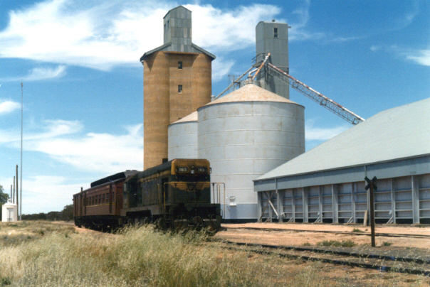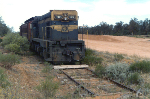 T413 took the special train right to the end of the line at Meringur, the line beyond this point to Morkalla having been lifted after closure. 23-11-1985. Photo: Bruce McLean