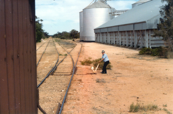 After inspecting the end of line, the train reversed into No.2 road. Guard Mr. T. Gottsutzke holds the spur lever for entry into No.2 road. The locomotive then shunted the rolling stock into reverse order. 23-11-1985. Photo: Bruce McLean