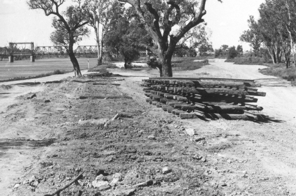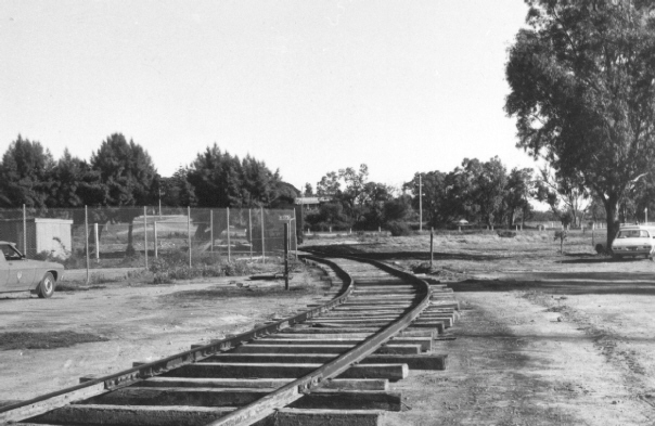 Track panels from the wharf line have been set out in the direction of the new playground on the site of the former siding that served Mildura power house. The downgrade line can be seen to the left. A carriage-way of Hugh King Drive now occupies this site. 14-9-1973. Photo: Bruce McLean