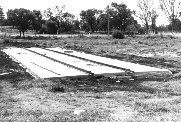 Mildura City Council workmen built a concrete pad with rails attached to house K175. Note the fishplates in position to connect with the temporary track used to transfer the locomotive. 14-9-1973. Photo: Bruce McLean