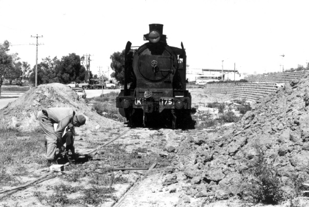 Workmen laying the track panels to enable K175 to be moved easily towards its playground destination. The operation was undertaken by pulling the locomotive forward to the end of the panels, removing panels from behind the locomotive to the front and repeating the process.14-9-1973. Photo: Bruce McLean
