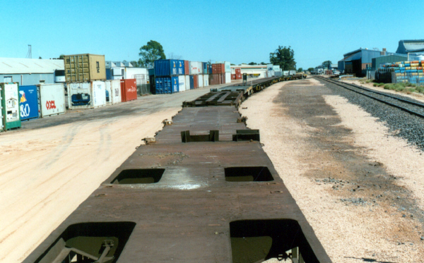 Freight Australia changed container charging arrangements with the result that Wakefield Transport developed a container storage area on the railway reserve at Merbein between the up end of the loop siding and the Aurora Packing Co. shed. In April 2002 the area was sealed to provide a significant container storage area. In this view we see containers stored parallel to the loop siding and empty container flat wagons ready for loading. 14-4-2002. Photo: Bruce McLean