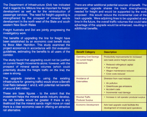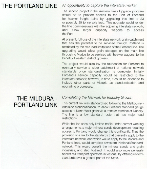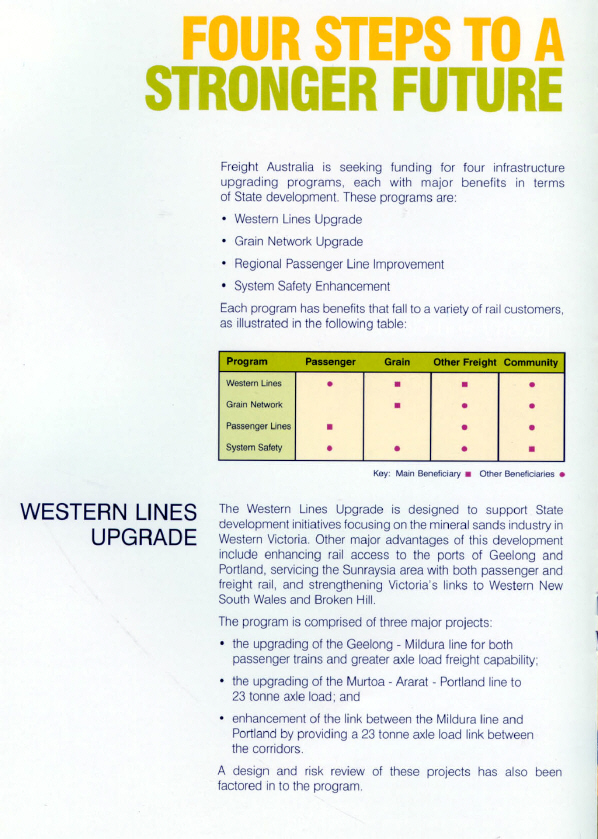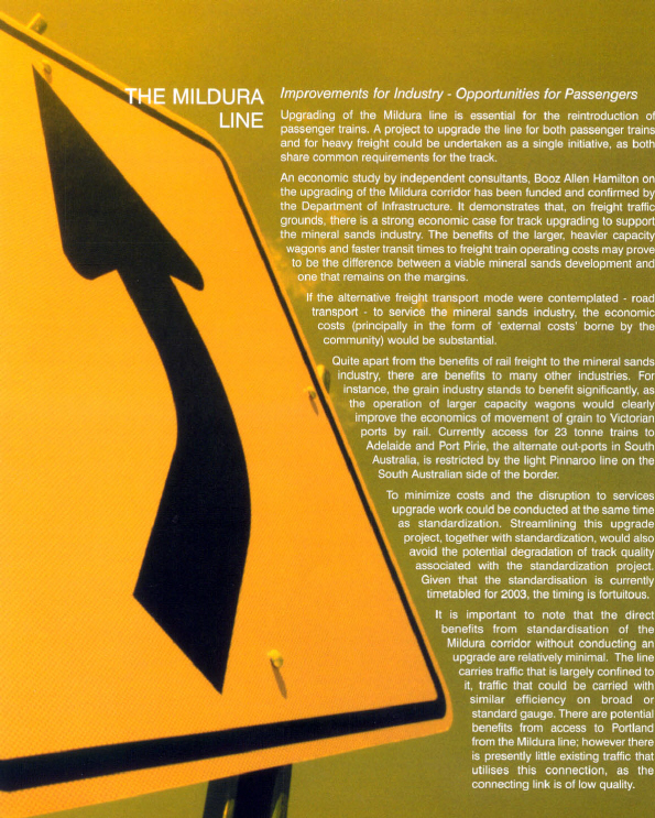 In June 2002, the Managing Director of Freight Australia, Mr. M. Van Onselen, released a document titled "Moving Ahead - A Plan for Better Rail Freight in Victoria". The plan was presented to the government and it now remained for the Minister for Transport to decide on the future approach to upgrading and standardisation of the Mildura line. Key pages from the document are reproduced herewith: