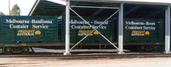 Containers marked for Echuca/Deniliquin, Portland and Sydney services. Mildura 21-8-2002. Photo: Bruce McLean