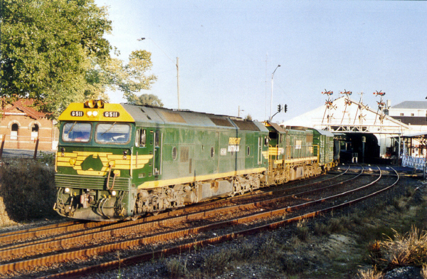 Class leader G511 and X54, the last X Class in service, with 9121 Down Ouyen goods departing from Ballarat on 6-2-2003. Photo: Jeff Bounds